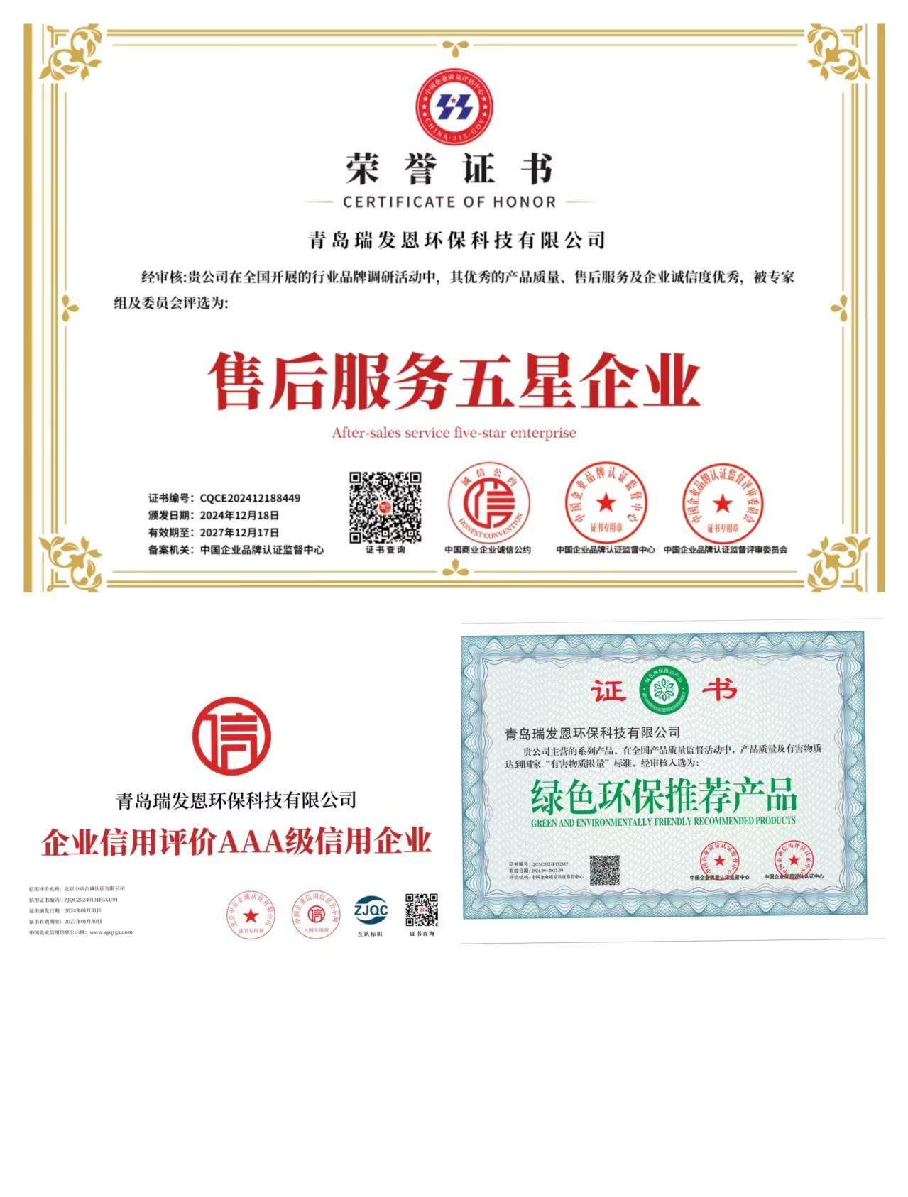公司已經通過環(huán)保,質量,安全三項認證,并獲得AAA信用等級認可、綠色環(huán)保推薦產品、售后服務五星企業證書。